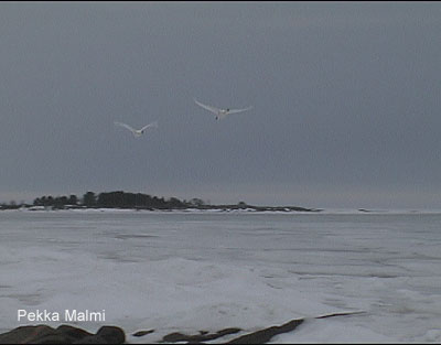 Kevään 2003 säästövapaat oli sovittu huhtikuun puoleenväliin, mutta suunniteltu kuvausprojekti Luopajärvelle peruuntui vähäisten tulvien vuoksi. Siispä auton nokka kohti Kauhajoen Uuronkylän majapaikkaa sekä länsirannikon hyviä staijauspaikkoja. Ajanjakson sää oli aurinkoinen, tuuli lännestä/luoteesta. Olosuhteet olivat poikkeukselliset jäätilanteen vuoksi. Tapaamani paikkakuntalainen lintuharrastaja kertoi merijäätä olevan ennätysmäärä 20 vuoteen. Havaintopaikkani sijaitsi Siipyyn tornin eteläpuolella n 2 km päässä sijaitsevalla niemenkärjellä. Lepäileviä, paikallisia hanhia ja joutsenia oli parhaiten Härkmerin tulvapelloilla. Seuraavassa retken havaintoja: |